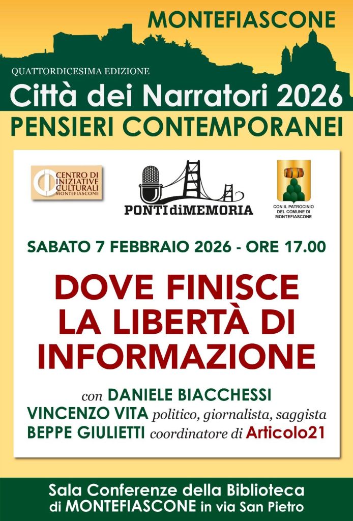 Torna a Montefiascone, per il terzo anno consecutivo, “Città dei narratori 2024”, la rassegna organizzata da Associazione Arci Ponti di memoria, in collaborazione con il Centro iniziative culturali e il patrocinio del Comune di Montefiascone. Al centro di questa edizione c’è la ricerca del pensiero critico contemporaneo su temi come la politica, il giornalismo, la libertà di stampa, la televisione, l’impegno sociale, la lotta alle illegalità, la richiesta di verità e giustizia (Ustica), la memoria. La formula è quella dell’intervista, aperta anche alle domande del pubblico. “In un momento dove pare sfuggire il senso alto della politica come Bene comune, dove nell’informazione conta di più il parere di un influencer sui social che il lavoro paziente e attento del cronista d’inchiesta, ‘Città dei narratori’ indaga sul pensiero critico, sulla capacità dei giornalisti di raccontare i fatti, di indagare sul potere senza fare sconti a nessuno, di mettere ancora in campo idee e visioni che possano offrire soluzioni alle tante, troppe domande dei cittadini rimaste inevase”, sostiene il giornalista e scrittore Daniele Biacchessi, direttore artistico della rassegna. Il cartellone si dipana nell’arco di un anno e tra ottobre e dicembre 2024 proporrà nuovi appuntamenti di riflessione.
